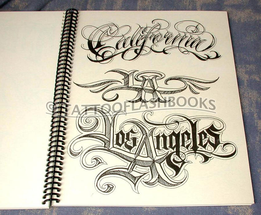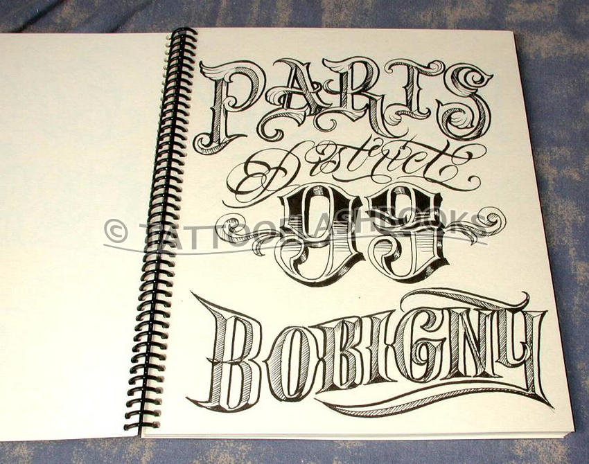 Thick, creme-colored cardstock-paged book of detailed, original script designs by the world's premier tattoo script master, Boog.