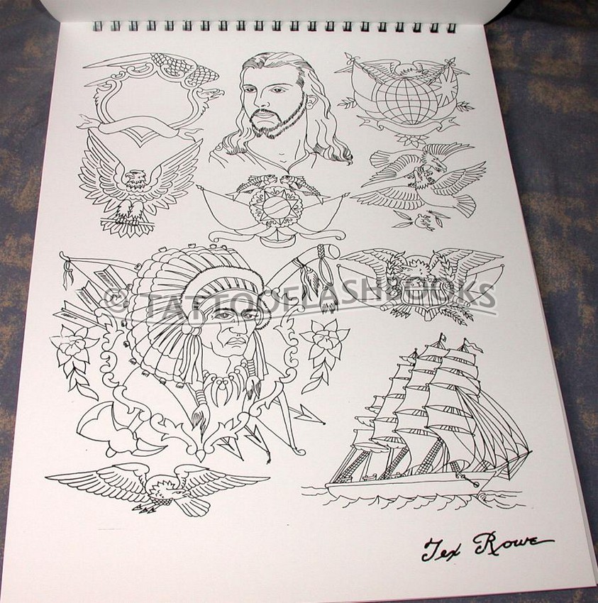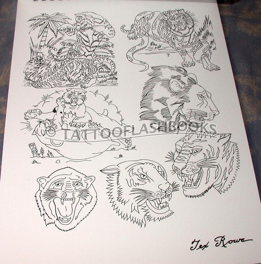 Very nice quality large-format forty-page book containing thirty years of chest and back designs by old-time tattooer, Tex Rowe. The cover is hand screen-printed with antique gold on heavy black matte board.